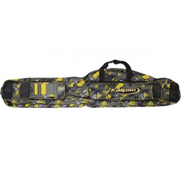 Вместительный чехол Kalipso с двумя большими отделами для удочек, спиннингов, фидерных удилищ. Ремень и ручки для переноски. Прочная моющаяся ткань, наружные карманы для мелочевки.