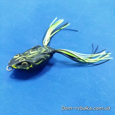 Плавающая поврехностная приманка оснащенная двойником и имитирующая лягушку - любимый кормовой объект многих крупных хищников. Имитацию лапок производят развевающиеся силиконовые нити собранные пучками у основания тела.