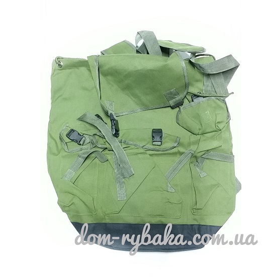 Брезентовий рюкзак темно-зеленого кольору. Міцні шлейки. Широкий клапан для захисту від опадів зверху. Розміри 60см висота ширина 40см глибина 20см..